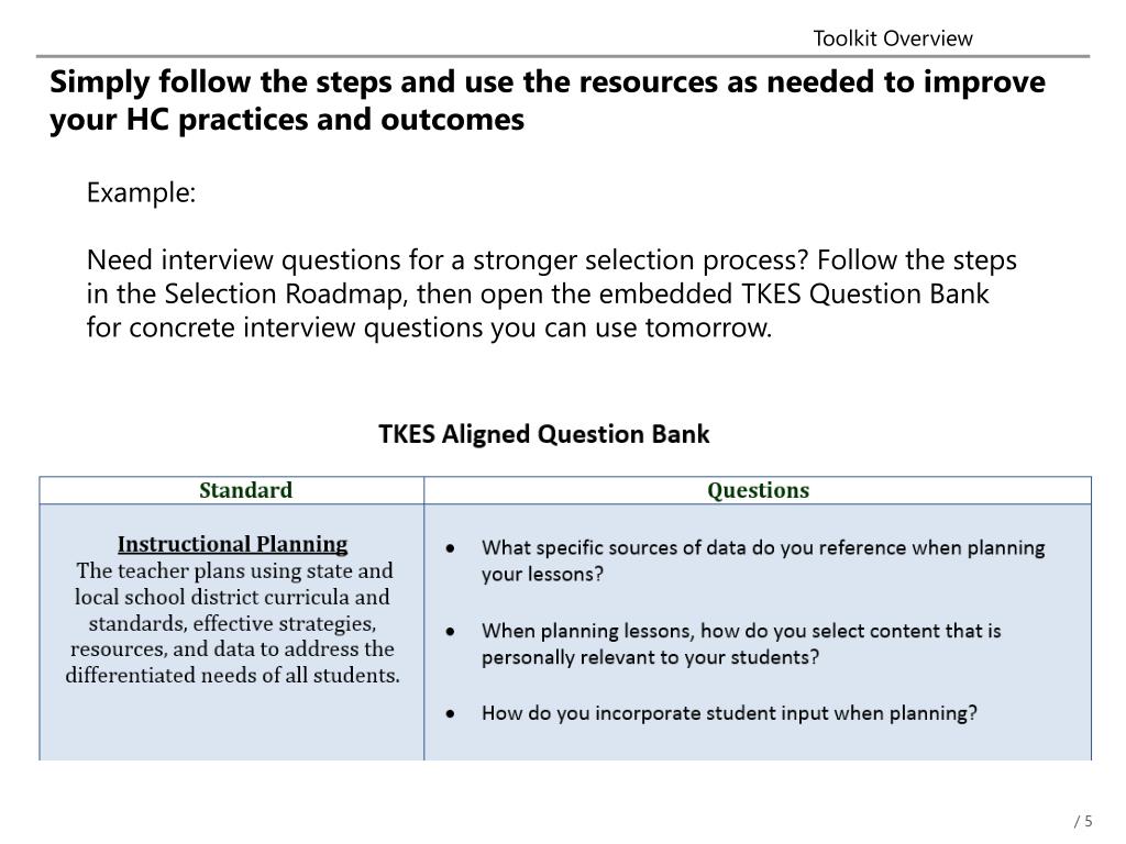 Toolkit Overview Simply follow the steps and use the resources as needed to improve your HC practices and outcomes Example: Need interview questions for a stronger selection process? Follow the steps in the Selection Roadmap, then open the embedded TKES Question Bank for concrete interview questions you can use tomorrow.