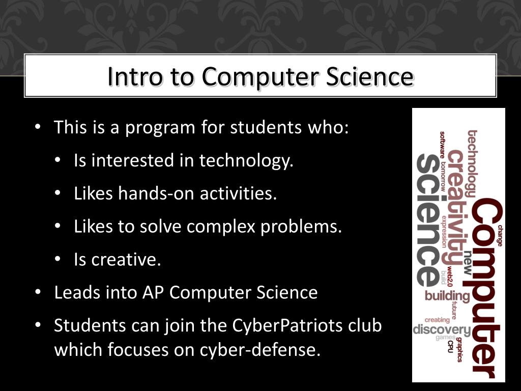 Intro to Computer Science This is a program for students who: Is interested in technology. Likes hands-on activities. Likes to solve complex problems. Is creative. Leads into AP Computer Science Students can join the CyberPatriots club which focuses on cyber-defense.