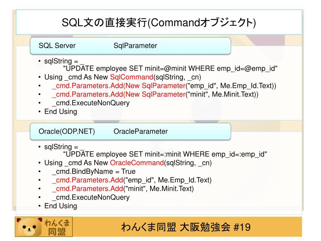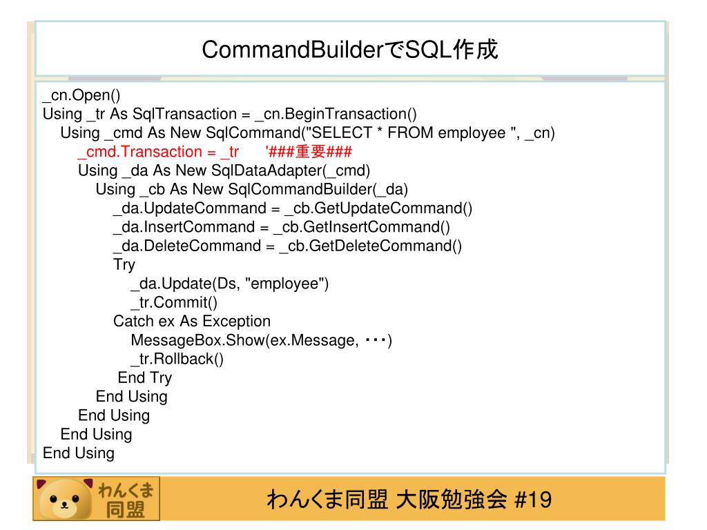CommandBuilderでSQL作成 _cn.Open() Using _tr As SqlTransaction = _cn.BeginTransaction() Using _cmd As New SqlCommand("SELECT * FROM employee ", _cn) _cmd.Transaction = _tr '###重要### Using _da As New SqlDataAdapter(_cmd) Using _cb As New SqlCommandBuilder(_da) _da.UpdateCommand = _cb.GetUpdateCommand() _da.InsertCommand = _cb.GetInsertCommand() _da.DeleteCommand = _cb.GetDeleteCommand() Try _da.Update(Ds, "employee") _tr.Commit() Catch ex As Exception MessageBox.Show(ex.Message, ・・・) _tr.Rollback() End Try End Using End Using End Using End Using