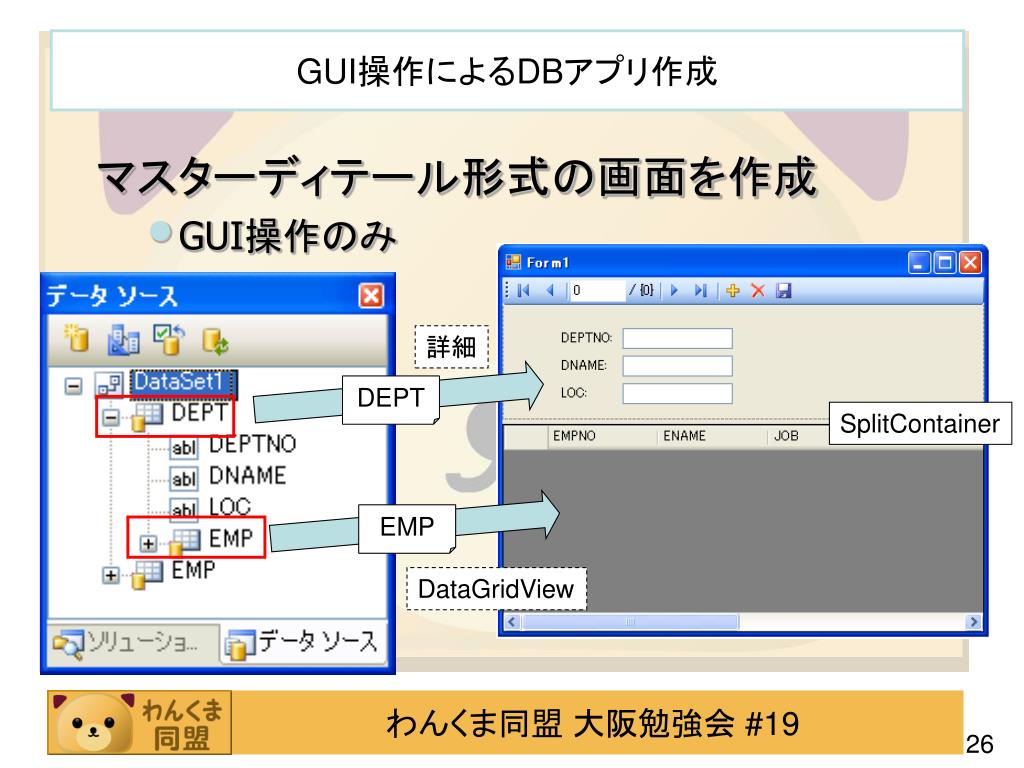 GUI操作によるDBアプリ作成 マスターディテール形式の画面を作成 • GUI操作のみ 詳細 DEPT SplitContainer EMP DataGridView