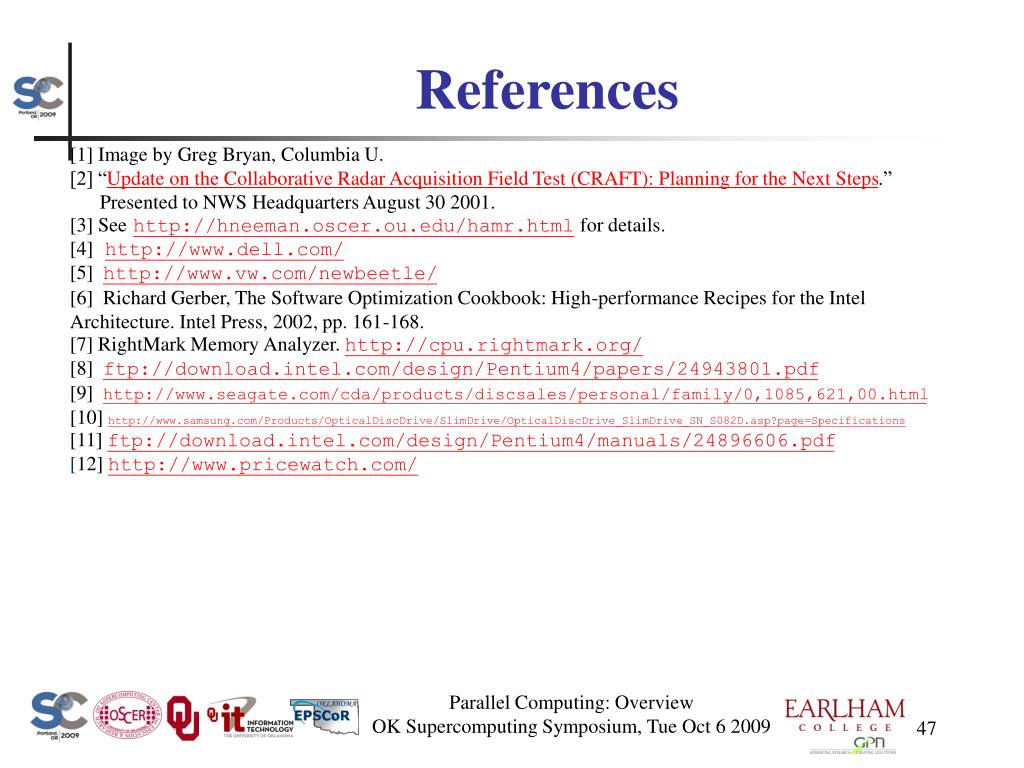 References [1] Image by Greg Bryan, Columbia U. [2] “Update on the Collaborative Radar Acquisition Field Test (CRAFT): Planning for the Next Steps.” Presented to NWS Headquarters August 30 2001. [3] Seehttp://hneeman.oscer.ou.edu/hamr.htmlfor details. [4]http://www.dell.com/ [5]http://www.vw.com/newbeetle/ [6] Richard Gerber, The Software Optimization Cookbook: High-performance Recipes for the Intel Architecture. Intel Press, 2002, pp. 161-168. [7]RightMark Memory Analyzer. http://cpu.rightmark.org/ [8]ftp://download.intel.com/design/Pentium4/papers/24943801.pdf [9] http://www.seagate.com/cda/products/discsales/personal/family/0,1085,621,00.html [10]http://www.samsung.com/Products/OpticalDiscDrive/SlimDrive/OpticalDiscDrive_SlimDrive_SN_S082D.asp?page=Specifications [11]ftp://download.intel.com/design/Pentium4/manuals/24896606.pdf [12]http://www.pricewatch.com/ Parallel Computing: Overview OK Supercomputing Symposium, Tue Oct 6 2009