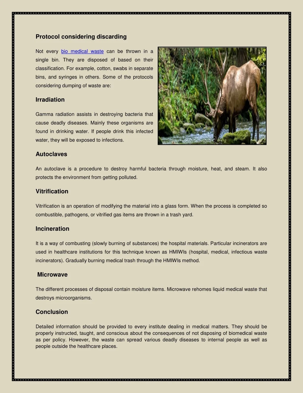 Protocol considering discarding Not every bio medical waste can be thrown in a single bin. They are disposed of based on their classification. For example, cotton, swabs in separate bins, and syringes in others. Some of the protocols considering dumping of waste are: Irradiation Gamma radiation assists in destroying bacteria that cause deadly diseases. Mainly these organisms are found in drinking water. If people drink this infected water, they will be exposed to infections. Autoclaves An autoclave is a procedure to destroy harmful bacteria through moisture, heat, and steam. It also protects the environment from getting polluted. Vitrification Vitrification is an operation of modifying the material into a glass form. When the process is completed so combustible, pathogens, or vitrified gas items are thrown in a trash yard. Incineration It is a way of combusting (slowly burning of substances) the hospital materials. Particular incinerators are used in healthcare institutions for this technique known as HMIWIs (hospital, medical, infectious waste incinerators). Gradually burning medical trash through the HMIWIs method. Microwave The different processes of disposal contain moisture items. Microwave rehomes liquid medical waste that destroys microorganisms. Conclusion Detailed information should be provided to every institute dealing in medical matters. They should be properly instructed, taught, and conscious about the consequences of not disposing of biomedical waste as per policy. However, the waste can spread various deadly diseases to internal people as well as people outside the healthcare places.