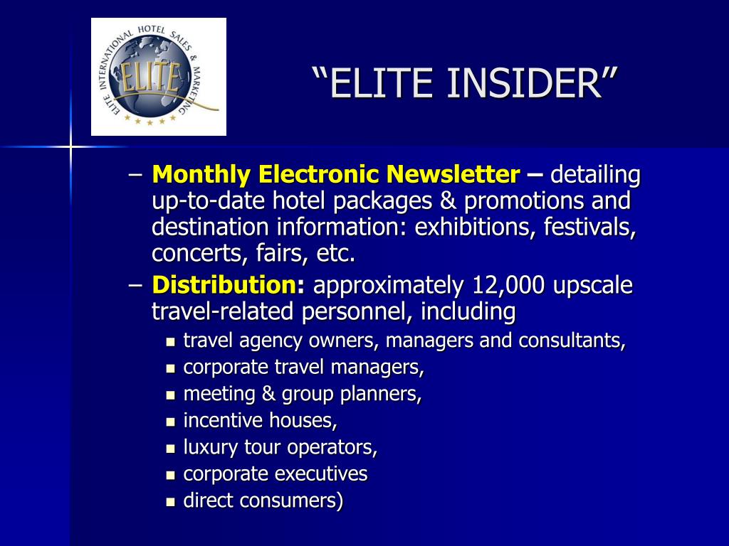 “ELITE INSIDER” • Monthly Electronic Newsletter – detailing up-to-date hotel packages & promotions and destination information: exhibitions, festivals, concerts, fairs, etc. • Distribution: approximately 12,000 upscale travel-related personnel, including • travel agency owners, managers and consultants, • corporate travel managers, • meeting & group planners, • incentive houses, • luxury tour operators, • corporate executives • direct consumers)