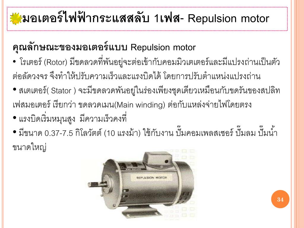 มอเตอร์ไฟฟ้ากระแสสลับ 1เฟส- Repulsion motor • คุณลักษณะของมอเตอร์แบบ Repulsion motor • โรเตอร์ (Rotor) มีขดลวดที่พันอยู่จะต่อเข้ากับคอมมิวเตเตอร์และมีแปรงถ่านเป็นตัวต่อลัดวงจร จึงทำให้ปรับความเร็วและแรงบิดได้ โดยการปรับตำแหน่งแปรงถ่าน • สเตเตอร์( Stator ) จะมีขดลวดพันอยู่ในร่องเพียงชุดเดียวเหมือนกับขดรันของสปลิทเฟสมอเตอร์ เรียกว่า ขดลวดเมน(Main winding) ต่อกับแหล่งจ่ายไฟโดยตรง • แรงบิดเริ่มหมุนสูง มีความเร็วคงที่ • มีขนาด 0.37-7.5 กิโลวัตต์ (10 แรงม้า) ใช้กับงาน ปั๊มคอมเพลสเซอร์ ปั๊มลม ปั๊มน้ำขนาดใหญ่