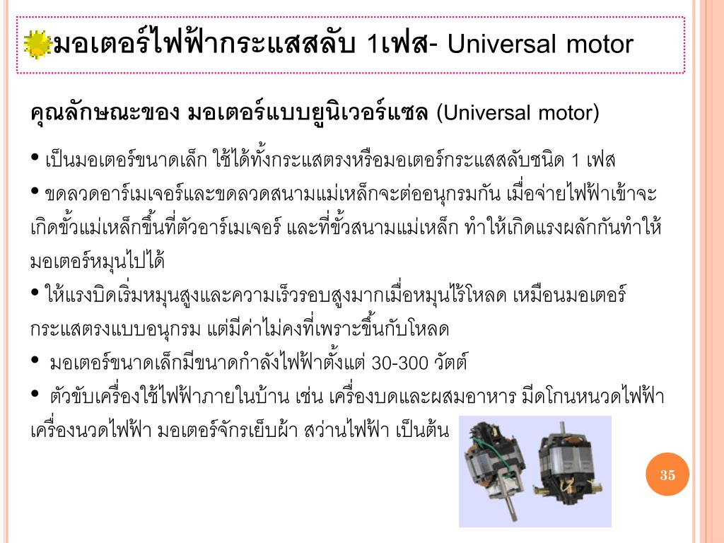 มอเตอร์ไฟฟ้ากระแสสลับ 1เฟส- Universal motor • คุณลักษณะของ มอเตอร์แบบยูนิเวอร์แซล (Universal motor) • เป็นมอเตอร์ขนาดเล็ก ใช้ได้ทั้งกระแสตรงหรือมอเตอร์กระแสสลับชนิด 1 เฟส • ขดลวดอาร์เมเจอร์และขดลวดสนามแม่เหล็กจะต่ออนุกรมกัน เมื่อจ่ายไฟฟ้าเข้าจะเกิดขั้วแม่เหล็กขึ้นที่ตัวอาร์เมเจอร์ และที่ขั้วสนามแม่เหล็ก ทำให้เกิดแรงผลักกันทำให้มอเตอร์หมุนไปได้ • ให้แรงบิดเริ่มหมุนสูงและความเร็วรอบสูงมากเมื่อหมุนไร้โหลด เหมือนมอเตอร์กระแสตรงแบบอนุกรม แต่มีค่าไม่คงที่เพราะขึ้นกับโหลด • มอเตอร์ขนาดเล็กมีขนาดกำลังไฟฟ้าตั้งแต่ 30-300 วัตต์ • ตัวขับเครื่องใช้ไฟฟ้าภายในบ้าน เช่น เครื่องบดและผสมอาหาร มีดโกนหนวดไฟฟ้า เครื่องนวดไฟฟ้า มอเตอร์จักรเย็บผ้า สว่านไฟฟ้า เป็นต้น