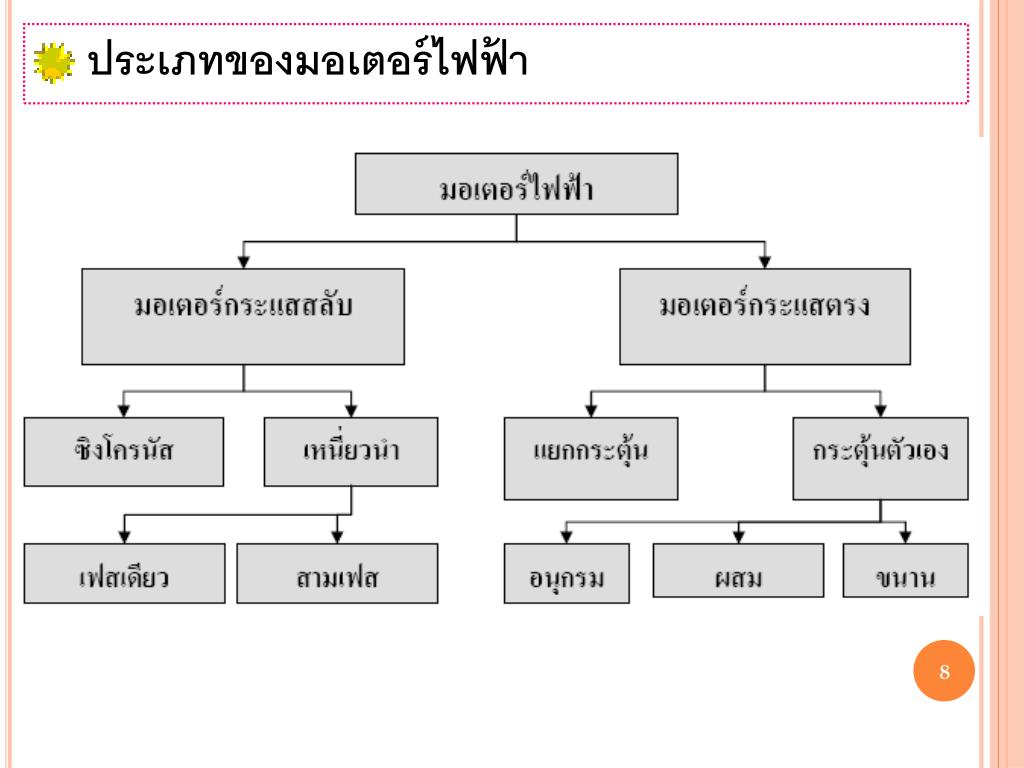 มอเตอร์ไฟฟ้า • คำนิยามของมอเตอร์ไฟฟ้า • หลักการทำงานของมอเตอร์ไฟฟ้า • ประเภทของมอเตอร์ไฟฟ้า • มอเตอร์ไฟฟ้ากระแสตรง • มอเตอร์ไฟฟ้ากระแสสลับ • การประยุกต์ใช้งานมอเตอร์ไฟฟ้า