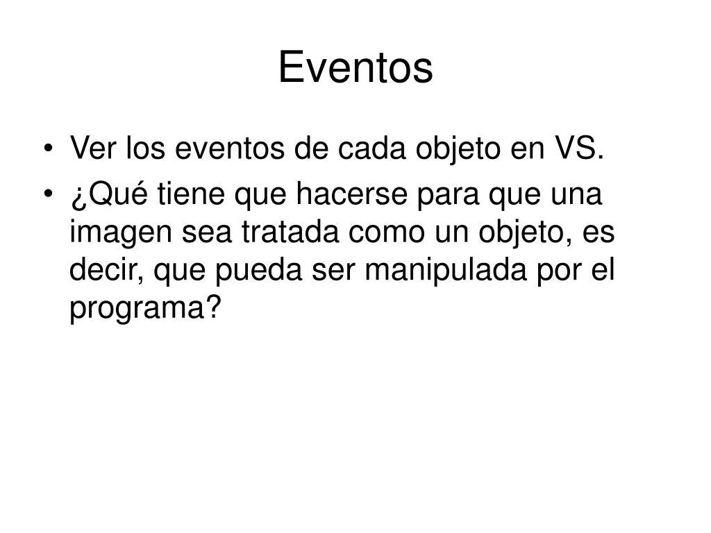 Eventos • Ver los eventos de cada objeto en VS. • ¿Qué tiene que hacerse para que una imagen sea tratada como un objeto, es decir, que pueda ser manipulada por el programa?