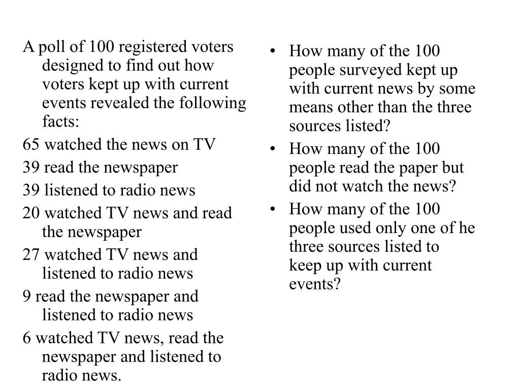 A poll of 100 registered voters designed to find out how voters kept up with current events revealed the following facts: 65 watched the news on TV 39 read the newspaper 39 listened to radio news 20 watched TV news and read the newspaper 27 watched TV news and listened to radio news 9 read the newspaper and listened to radio news 6 watched TV news, read the newspaper and listened to radio news. How many of the 100 people surveyed kept up with current news by some means other than the three sources listed? How many of the 100 people read the paper but did not watch the news? How many of the 100 people used only one of he three sources listed to keep up with current events?