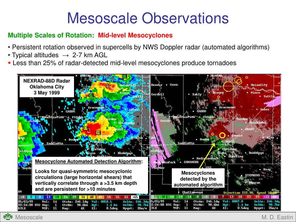 Mesoscale Observations • Multiple Scales of Rotation: Mid-level Mesocyclones • Persistent rotation observed in supercells by NWS Doppler radar (automated algorithms) • Typical altitudes → 2-7 km AGL • Less than 25% of radar-detected mid-level mesocyclones produce tornadoes NEXRAD-88D Radar Oklahoma City 3 May 1999 Mesocyclone Automated Detection Algorithm: Looks for quasi-symmetric mesocyclonic circulations (large horizontal shears) that vertically correlate through a >3.5 km depth and are persistent for >10 minutes Mesocyclones detected by the automated algorithm M. D. Eastin