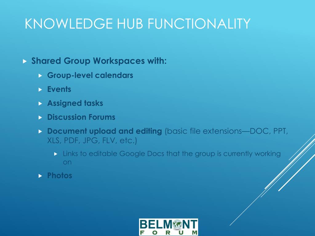 Knowledge Hub Functionality • Shared Group Workspaces with: • Group-level calendars • Events • Assigned tasks • Discussion Forums • Document upload and editing (basic file extensions—DOC, PPT, XLS, PDF, JPG, FLV, etc.) • Links to editable Google Docs that the group is currently working on • Photos