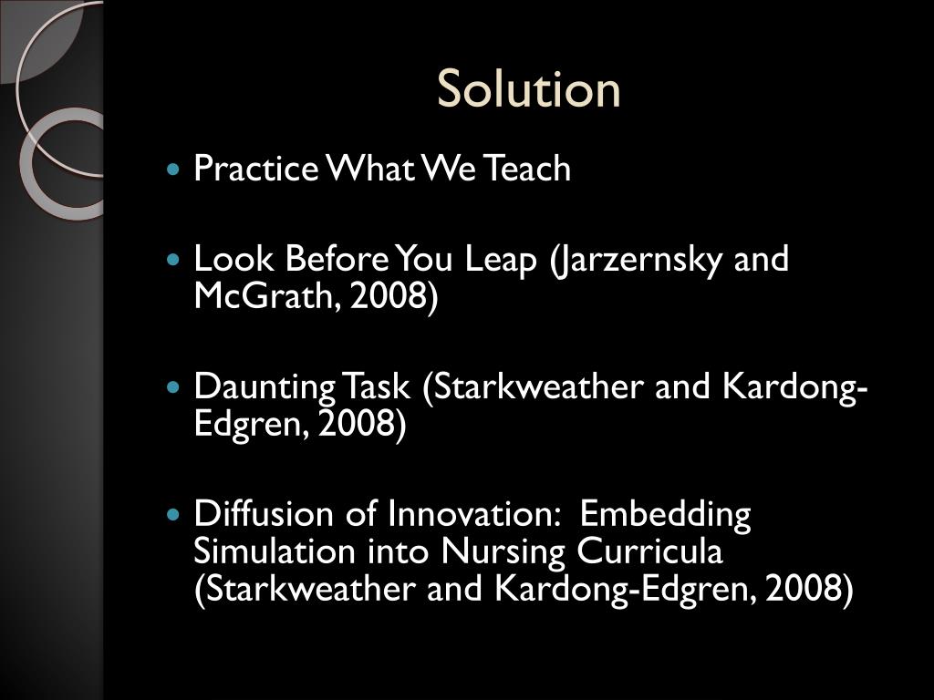 Solution • Practice What We Teach • Look Before You Leap (Jarzernsky and McGrath, 2008) • Daunting Task (Starkweather and Kardong-Edgren, 2008) • Diffusion of Innovation: Embedding Simulation into Nursing Curricula (Starkweather and Kardong-Edgren, 2008)