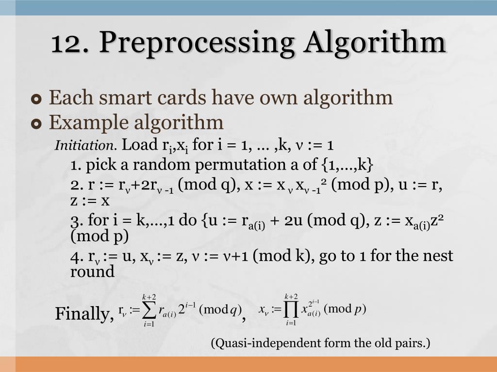 12. Preprocessing Algorithm • Each smart cards have own algorithm • Example algorithm Initiation. Load ri,xi for i = 1, … ,k, ν := 1 1. pick a random permutation a of {1,…,k} 2. r := rν+2rν -1 (mod q), x := x ν xν -12 (mod p), u := r, z := x 3. for i = k,…,1 do {u := ra(i) + 2u (mod q), z := xa(i)z2 (mod p) 4. rν:= u, xν := z, ν := ν+1 (mod k), go to 1 for the nest round Finally, , (Quasi-independent form the old pairs.)