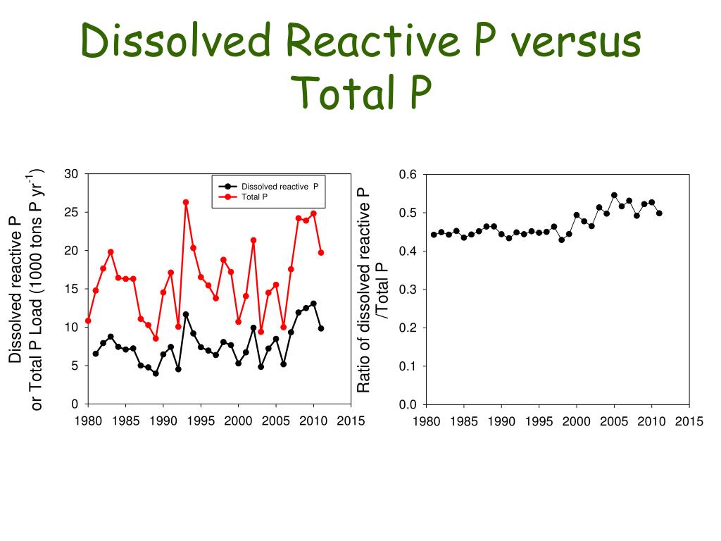 Trends through time • no significant trend for flow using linear regression of annual volume • regression model with flow and time • for nitrate, R2=0.77, flow p < 0.0001, year not significant • for total P, R2=0.97, flow and year both significant at p < 0.0001 • for DRP, R2=0.96, flow and year both significant at p < 0.0001