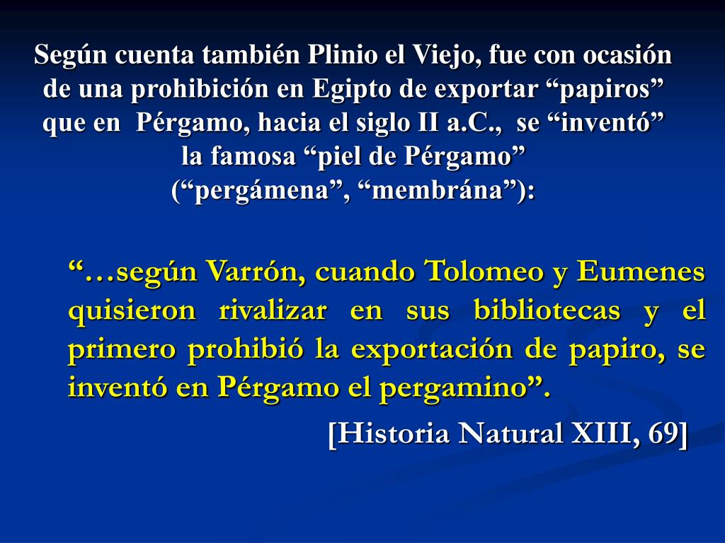Según cuenta también Plinio el Viejo, fue con ocasión de una prohibición en Egipto de exportar “papiros” que en Pérgamo, hacia el siglo II a.C., se “inventó” la famosa “piel de Pérgamo” (“pergámena”, “membrána”): “…según Varrón, cuando Tolomeo y Eumenes quisieron rivalizar en sus bibliotecas y el primero prohibió la exportación de papiro, se inventó en Pérgamo el pergamino”. [Historia Natural XIII, 69]
