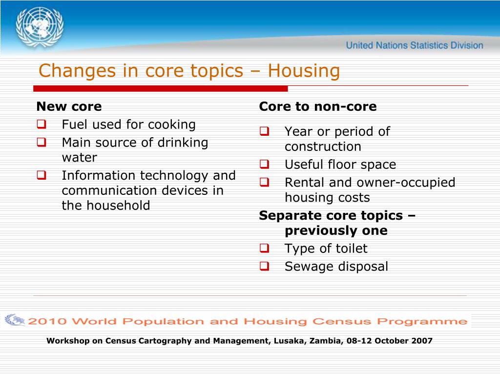 New core Fuel used for cooking Main source of drinking water Information technology and communication devices in the household Core to non-core Year or period of construction Useful floor space Rental and owner-occupied housing costs Separate core topics – previously one Type of toilet Sewage disposal Changes in core topics – Housing Workshop on Census Cartography and Management, Lusaka, Zambia, 08-12 October 2007