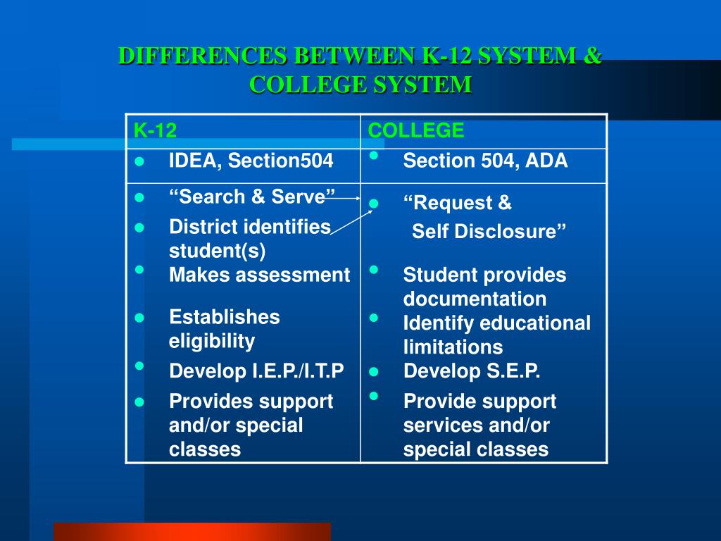 DIFFERENCES BETWEEN K-12 SYSTEM & COLLEGE SYSTEM • IDEA, Section504 • Section 504, ADA • “Search & Serve” • “Request & Self Disclosure” • District identifies student(s) • Makes assessment • Student provides documentation • Establishes eligibility • Identify educational limitations • Develop I.E.P./I.T.P • Develop S.E.P. • Provides support and/or special classes • Provide support services and/or special classes