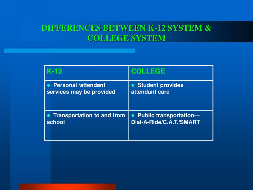 DIFFERENCES BETWEEN K-12 SYSTEM & COLLEGE SYSTEM • Personal /attendant services may be provided • Student provides attendant care • Transportation to and from school • Public transportation—Dial-A-Ride/C.A.T./SMART