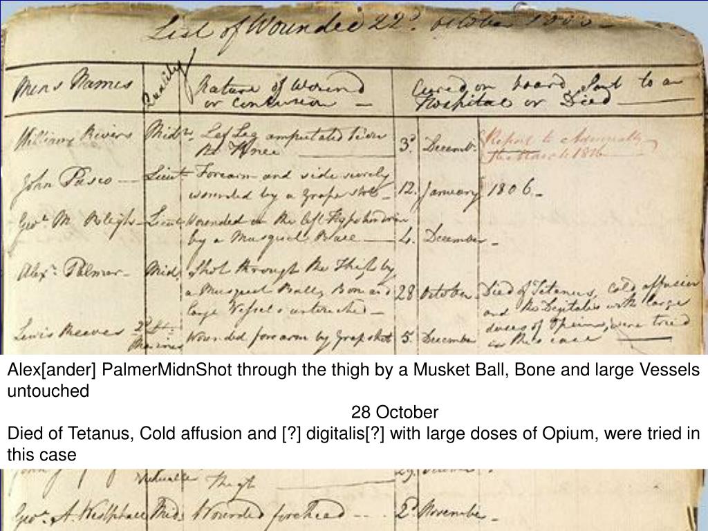 Alex[ander] PalmerMidnShot through the thigh by a Musket Ball, Bone and large Vessels untouched 28 OctoberDied of Tetanus, Cold affusion and [?] digitalis[?] with large doses of Opium, were tried in this case