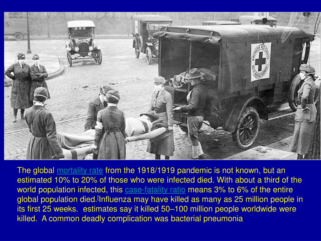 The global mortality rate from the 1918/1919 pandemic is not known, but an estimated 10% to 20% of those who were infected died. With about a third of the world population infected, this case-fatality ratio means 3% to 6% of the entire global population died.[Influenza may have killed as many as 25 million people in its first 25 weeks. estimates say it killed 50–100 million people worldwide were killed. A common deadly complication was bacterial pneumonia