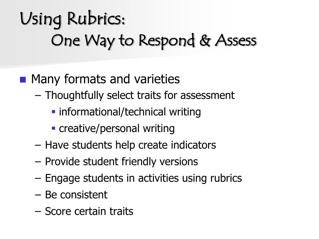 Using Rubrics:One Way to Respond & Assess • Many formats and varieties • Thoughtfully select traits for assessment • informational/technical writing • creative/personal writing • Have students help create indicators • Provide student friendly versions • Engage students in activities using rubrics • Be consistent • Score certain traits