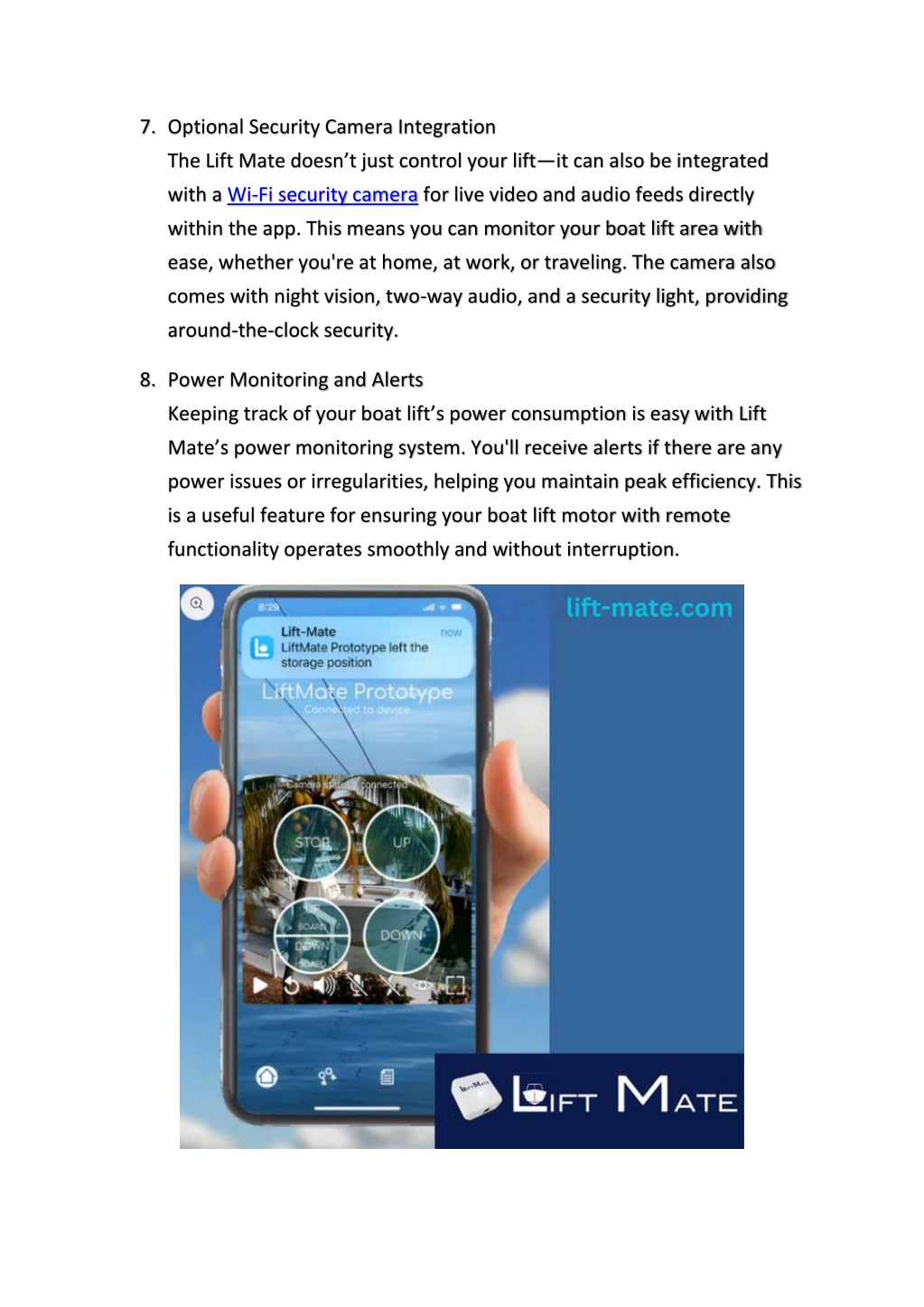 7.Optional Security Camera Integration The Lift Mate doesn’t just control your lift—it can also be integrated with a Wi-Fi security camera for live video and audio feeds directly within the app. This means you can monitor your boat lift area with ease, whether you're at home, at work, or traveling. The camera also comes with night vision, two-way audio, and a security light, providing around-the-clock security. 8.Power Monitoring and Alerts Keeping track of your boat lift’s power consumption is easy with Lift Mate’s power monitoring system. You'll receive alerts if there are any power issues or irregularities, helping you maintain peak efficiency. This is a useful feature for ensuring your boat lift motor with remote functionality operates smoothly and without interruption.