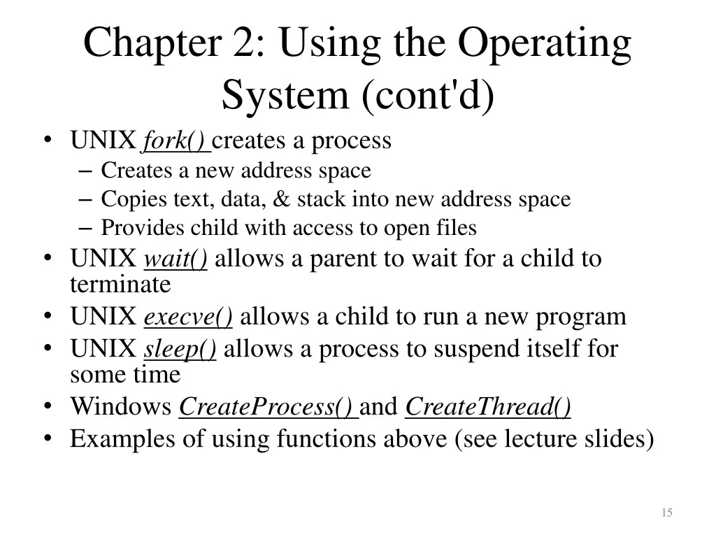 Chapter 2: Using the Operating System (cont'd) • UNIX fork() creates a process • Creates a new address space • Copies text, data, & stack into new address space • Provides child with access to open files • UNIX wait()allows a parent to wait for a child to terminate • UNIX execve()allows a child to run a new program • UNIX sleep() allows a process to suspend itself for some time • Windows CreateProcess() and CreateThread() • Examples of using functions above (see lecture slides)