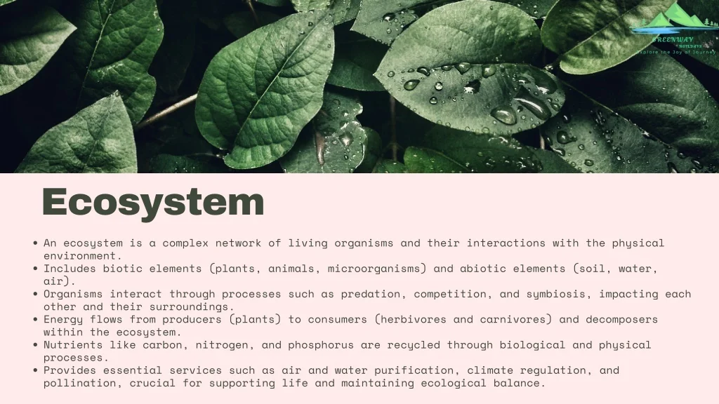 Ecosystem An ecosystem is a complex network of living organisms and their interactions with the physical environment. Includes biotic elements (plants, animals, microorganisms) and abiotic elements (soil, water, air). Organisms interact through processes such as predation, competition, and symbiosis, impacting each other and their surroundings. Energy flows from producers (plants) to consumers (herbivores and carnivores) and decomposers within the ecosystem. Nutrients like carbon, nitrogen, and phosphorus are recycled through biological and physical processes. Provides essential services such as air and water purification, climate regulation, and pollination, crucial for supporting life and maintaining ecological balance.