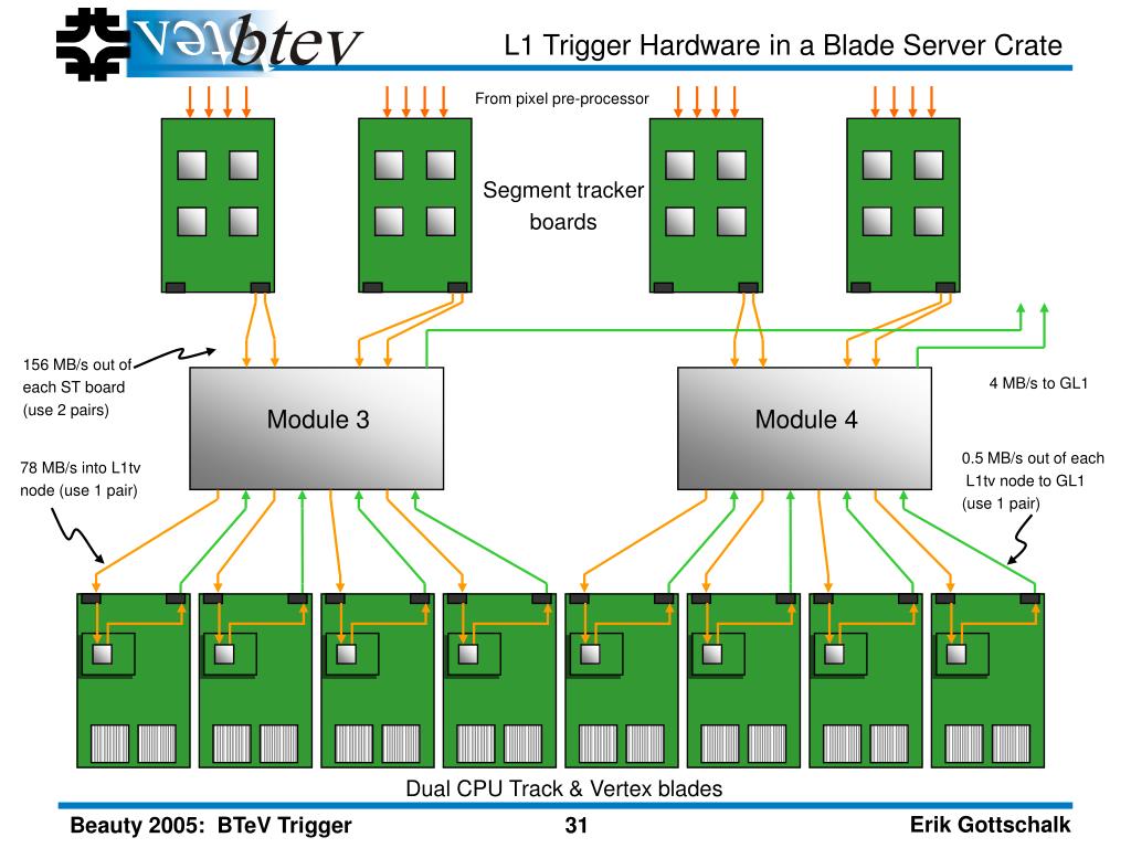 156 MB/s out of each ST board (use 2 pairs) Module 3 Module 4 0.5 MB/s out of each L1tv node to GL1 (use 1 pair) 78 MB/s into L1tv node (use 1 pair) L1 Trigger Hardware in a Blade Server Crate From pixel pre-processor Segment tracker boards 4 MB/s to GL1 Dual CPU Track & Vertex blades