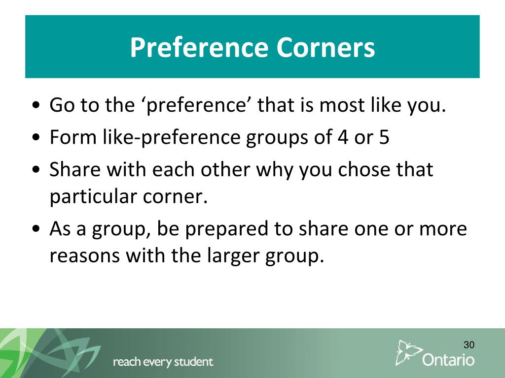 Preference Corners • Go to the ‘preference’ that is most like you. • Form like-preference groups of 4 or 5 • Share with each other why you chose that particular corner. • As a group, be prepared to share one or more reasons with the larger group.
