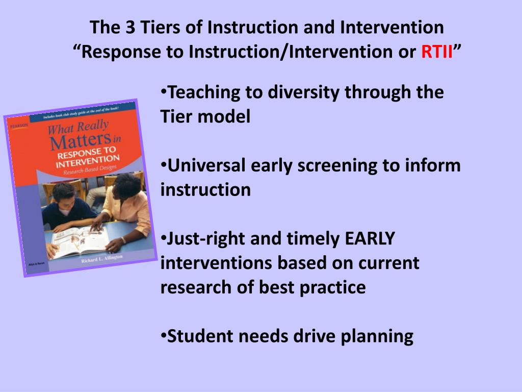 The 3 Tiers of Instruction and Intervention“Response to Instruction/Intervention or RTII” • Teaching to diversity through the Tier model • Universal early screening to inform instruction • Just-right and timely EARLY interventions based on current research of best practice • Student needs drive planning