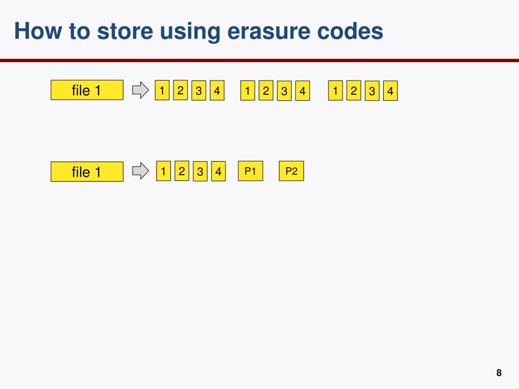 How to store using erasure codes file 1 2 1 4 3 2 2 1 1 4 4 3 3 2 1 P1 P2 4 3 file 1