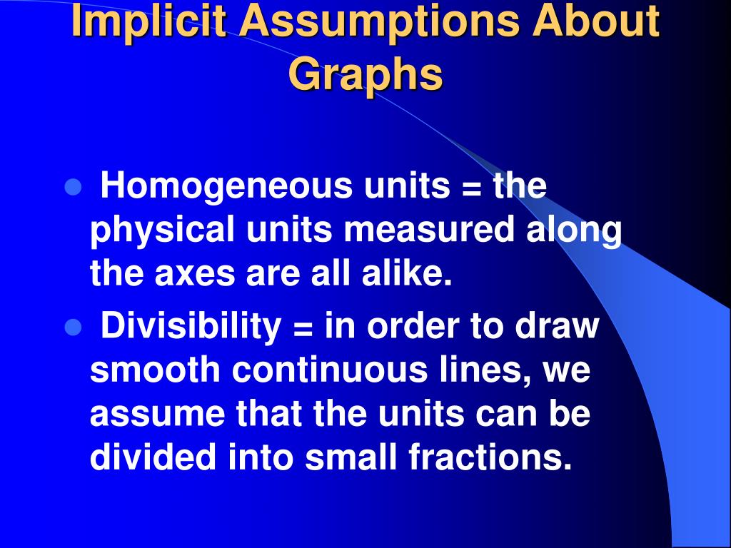 Implicit Assumptions About Graphs • Homogeneous units = the physical units measured along the axes are all alike. • Divisibility = in order to draw smooth continuous lines, we assume that the units can be divided into small fractions.