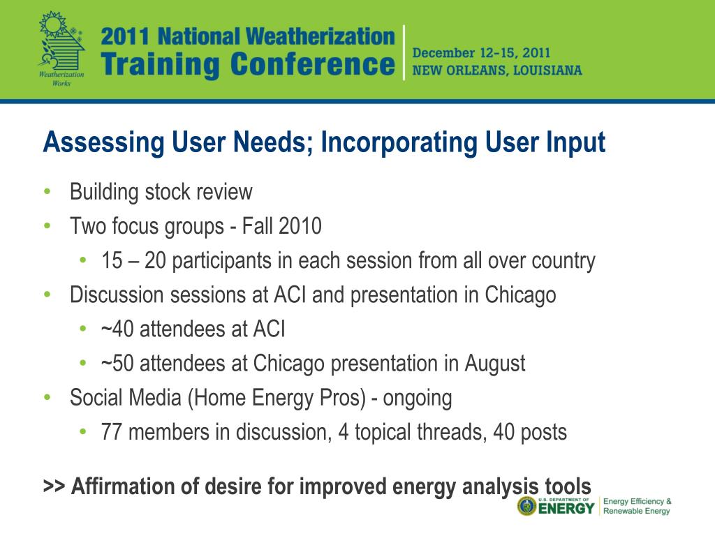 Assessing User Needs; Incorporating User Input • Building stock review • Two focus groups - Fall 2010 • 15 – 20 participants in each session from all over country • Discussion sessions at ACI and presentation in Chicago • ~40 attendees at ACI • ~50 attendees at Chicago presentation in August • Social Media (Home Energy Pros) - ongoing • 77 members in discussion, 4 topical threads, 40 posts >> Affirmation of desire for improved energy analysis tools