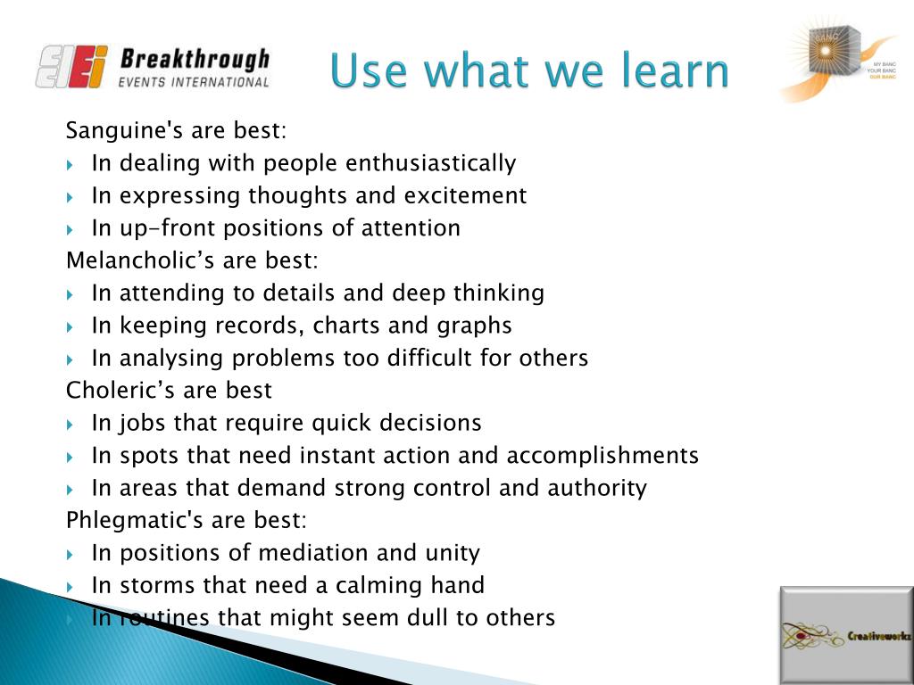 Use what we learn Sanguine's are best: • In dealing with people enthusiastically • In expressing thoughts and excitement • In up-front positions of attention Melancholic’s are best: • In attending to details and deep thinking • In keeping records, charts and graphs • In analysing problems too difficult for others Choleric’s are best • In jobs that require quick decisions • In spots that need instant action and accomplishments • In areas that demand strong control and authority Phlegmatic's are best: • In positions of mediation and unity • In storms that need a calming hand • In routines that might seem dull to others