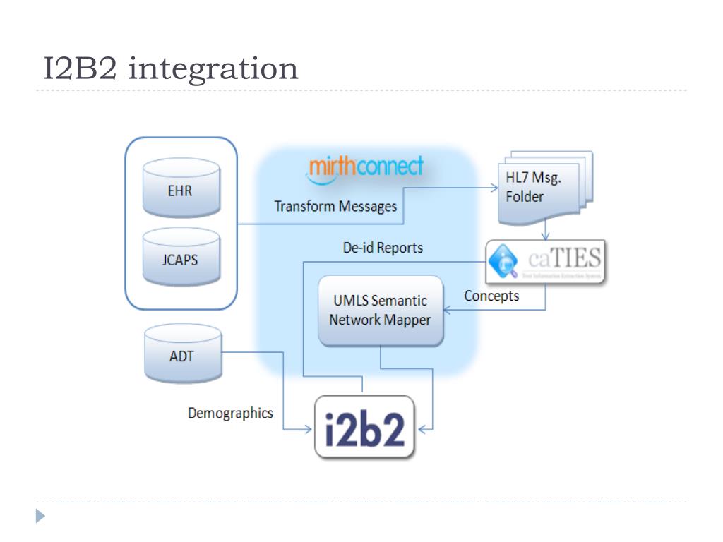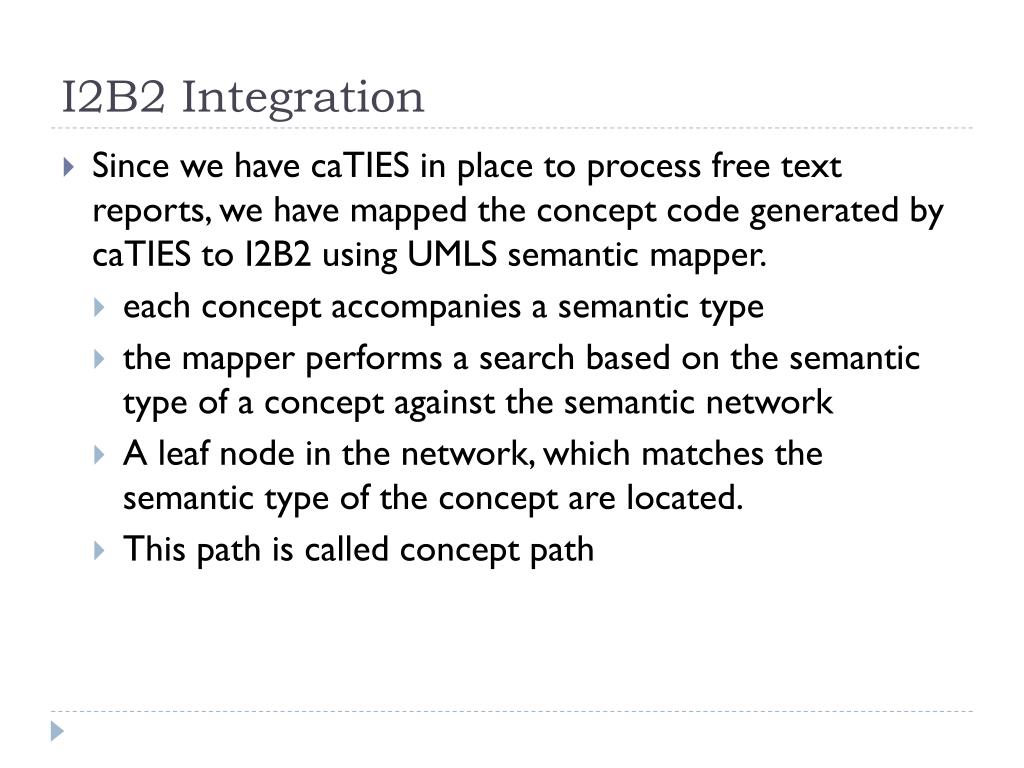 I2B2 Integration • Since we have caTIES in place to process free text reports, we have mapped the concept code generated by caTIES to I2B2 using UMLS semantic mapper. • each concept accompanies a semantic type • the mapper performs a search based on the semantic type of a concept against the semantic network • A leaf node in the network, which matches the semantic type of the concept are located. • This path is called concept path
