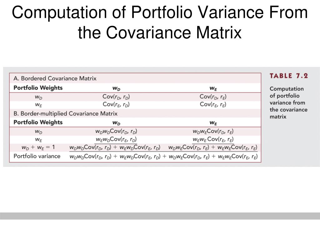 Covariance Cov(rD,rE) = DEDE D,E = Correlation coefficient of returns D = Standard deviation of returns for Security D E = Standard deviation of returns for Security E