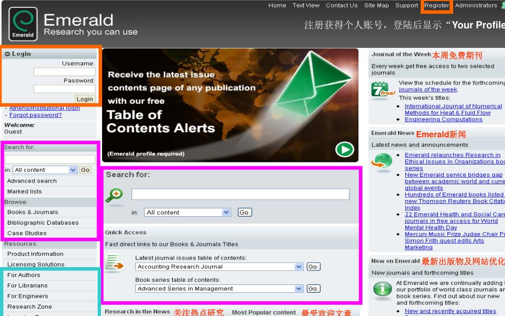 注册获得个人账号,登陆后显示“Your Profile” 本周免费期刊 Emerald新闻 最新出版物及网站优化 关注热点研究 最受欢迎文章