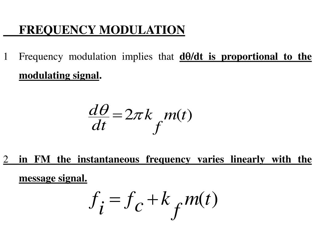 FREQUENCY MODULATION 1 Frequency modulation implies that d/dt is proportional to the modulating signal. 2 in FM the instantaneous frequency varies linearly with the message signal.