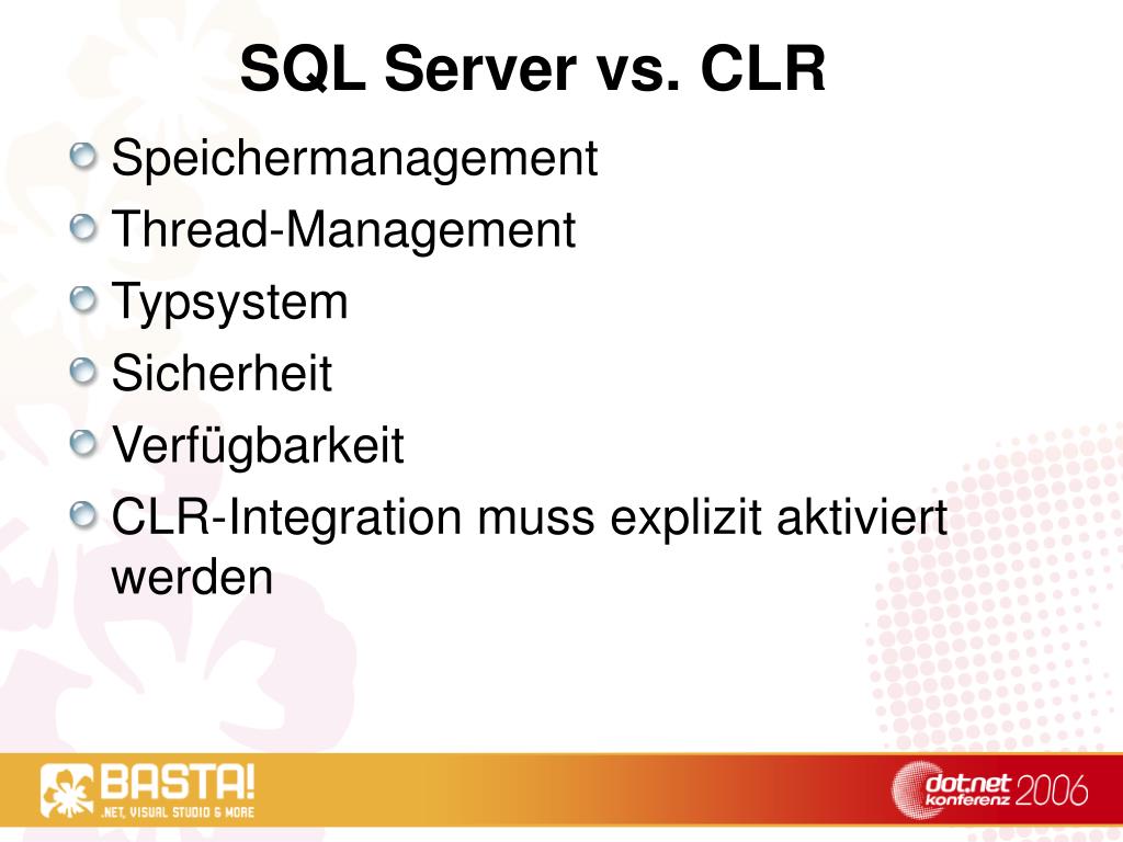 SQL Server vs. CLR • Speichermanagement • Thread-Management • Typsystem • Sicherheit • Verfügbarkeit • CLR-Integration muss explizit aktiviert werden