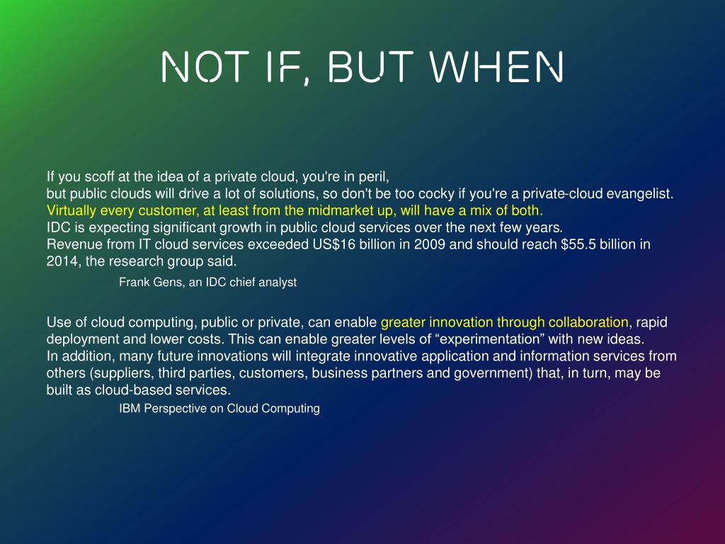 NOT IF, BUT WHEN If you scoff at the idea of a private cloud, you're in peril, butpublic clouds will drive a lot of solutions, so don't be too cocky if you're a private-cloud evangelist. Virtually every customer, at least from the midmarket up, will have a mix of both.IDC is expecting significant growth in public cloud services over the next few years.Revenue from IT cloud services exceeded US$16 billion in 2009 and should reach $55.5 billion in 2014, the research group said. Frank Gens, an IDC chief analyst Use of cloud computing, public or private, can enable greater innovation through collaboration,rapid deployment and lower costs. This can enable greater levels of “experimentation”with new ideas. In addition, many future innovations will integrate innovativeapplication and information services from others (suppliers, third parties, customers,business partners and government) that, in turn, may be built as cloud-based services. IBM Perspective on Cloud Computing