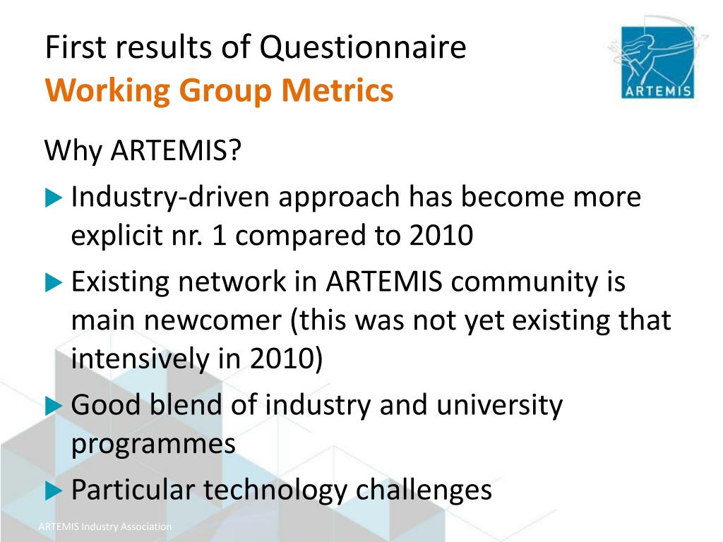 First results of QuestionnaireWorking Group Metrics Why ARTEMIS? • Industry-driven approach has become more explicit nr. 1 compared to 2010 • Existing network in ARTEMIS community is main newcomer (this was not yet existing that intensively in 2010) • Good blend of industry and university programmes • Particular technology challenges