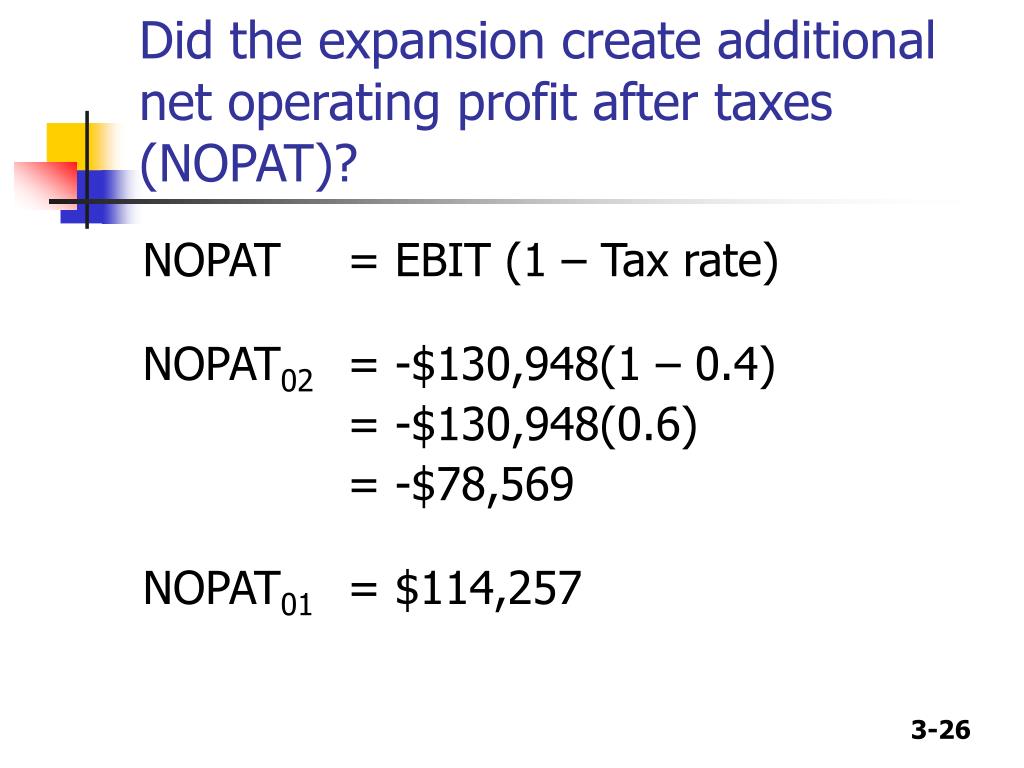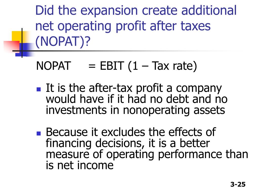 Did the expansion create additional net operating profit after taxes (NOPAT)? NOPAT = EBIT (1 – Tax rate) • It is the after-tax profit a company would have if it had no debt and no investments in nonoperating assets • Because it excludes the effects of financing decisions, it is a better measure of operating performance than is net income