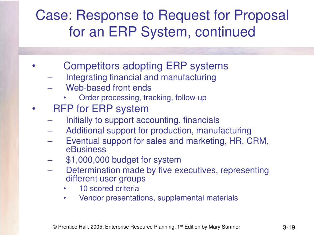 Case: Response to Request for Proposal for an ERP System, continued • Competitors adopting ERP systems • Integrating financial and manufacturing • Web-based front ends • Order processing, tracking, follow-up • RFP for ERP system • Initially to support accounting, financials • Additional support for production, manufacturing • Eventual support for sales and marketing, HR, CRM, eBusiness • $1,000,000 budget for system • Determination made by five executives, representing different user groups • 10 scored criteria • Vendor presentations, supplemental materials © Prentice Hall, 2005: Enterprise Resource Planning, 1st Edition by Mary Sumner