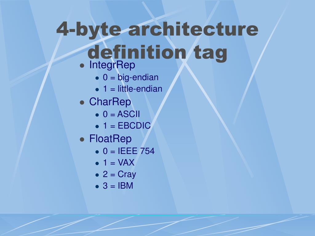 4-byte architecture definition tag • IntegrRep • 0 = big-endian • 1 = little-endian • CharRep • 0 = ASCII • 1 = EBCDIC • FloatRep • 0 = IEEE 754 • 1 = VAX • 2 = Cray • 3 = IBM