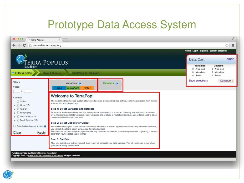 TerraPop Vision An organizational and technical framework to preserve, integrate, disseminate, and analyze global-scale spatiotemporal data describing population and the environment. • Develop tools to make data interoperable across data formats and subject areas • Break down disciplinary silos