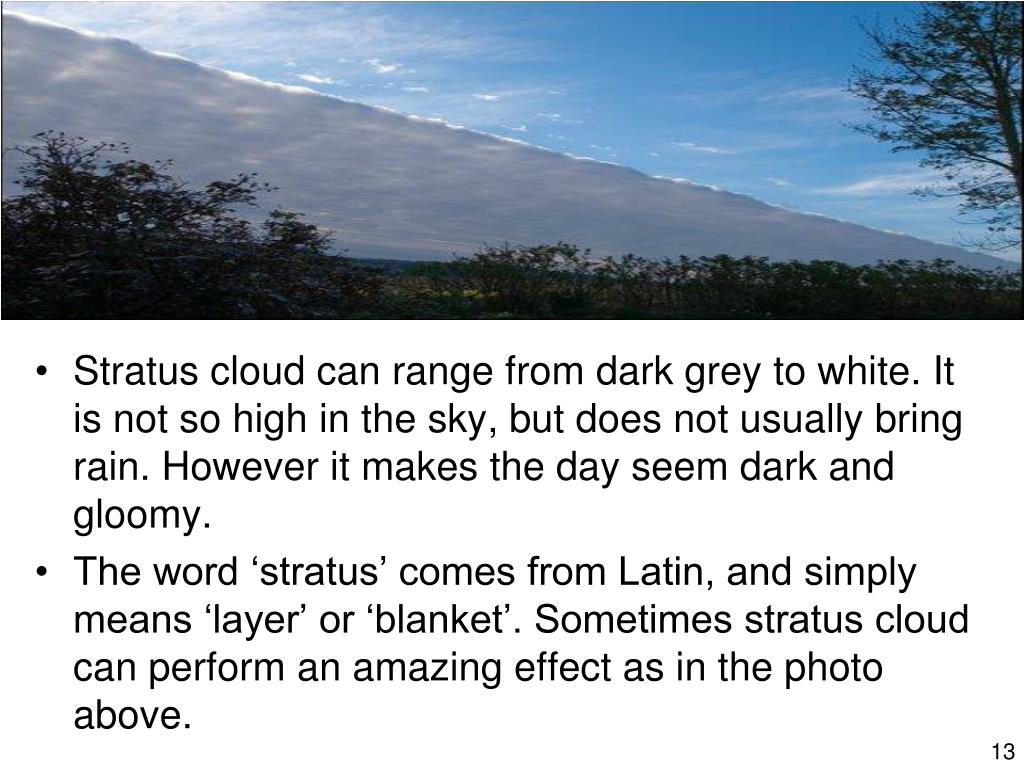 Stratus cloud can range from dark grey to white. It is not so high in the sky, but does not usually bring rain. However it makes the day seem dark and gloomy. • The word ‘stratus’ comes from Latin, and simply means ‘layer’ or ‘blanket’. Sometimes stratus cloud can perform an amazing effect as in the photo above.