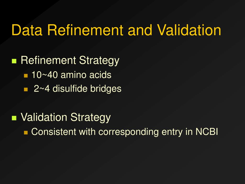Data Refinement and Validation • Refinement Strategy • 10~40 amino acids • 2~4 disulfide bridges • Validation Strategy • Consistent with corresponding entry in NCBI