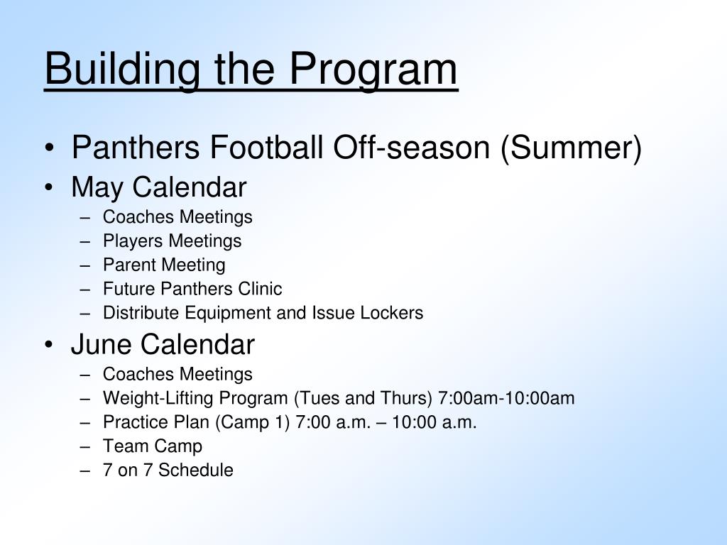 Building the Program • Panthers Football Off-season (Summer) • May Calendar • Coaches Meetings • Players Meetings • Parent Meeting • Future Panthers Clinic • Distribute Equipment and Issue Lockers • June Calendar • Coaches Meetings • Weight-Lifting Program (Tues and Thurs) 7:00am-10:00am • Practice Plan (Camp 1) 7:00 a.m. – 10:00 a.m. • Team Camp • 7 on 7 Schedule