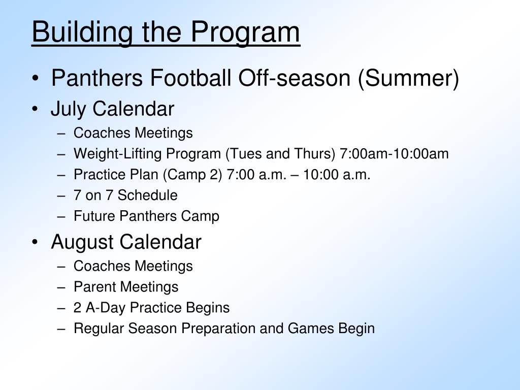 Building the Program • Panthers Football Off-season (Summer) • July Calendar • Coaches Meetings • Weight-Lifting Program (Tues and Thurs) 7:00am-10:00am • Practice Plan (Camp 2) 7:00 a.m. – 10:00 a.m. • 7 on 7 Schedule • Future Panthers Camp • August Calendar • Coaches Meetings • Parent Meetings • 2 A-Day Practice Begins • Regular Season Preparation and Games Begin