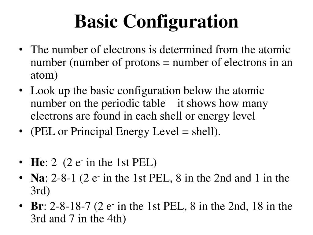 Basic Configuration • The number of electrons is determined from the atomic number (number of protons = number of electrons in an atom) • Look up the basic configuration below the atomic number on the periodic table—it shows how many electrons are found in each shell or energy level • (PEL or Principal Energy Level = shell). • He: 2 (2 e- in the 1st PEL) • Na: 2-8-1 (2 e- in the 1st PEL, 8 in the 2nd and 1 in the 3rd) • Br: 2-8-18-7 (2 e- in the 1st PEL, 8 in the 2nd, 18 in the 3rd and 7 in the 4th)